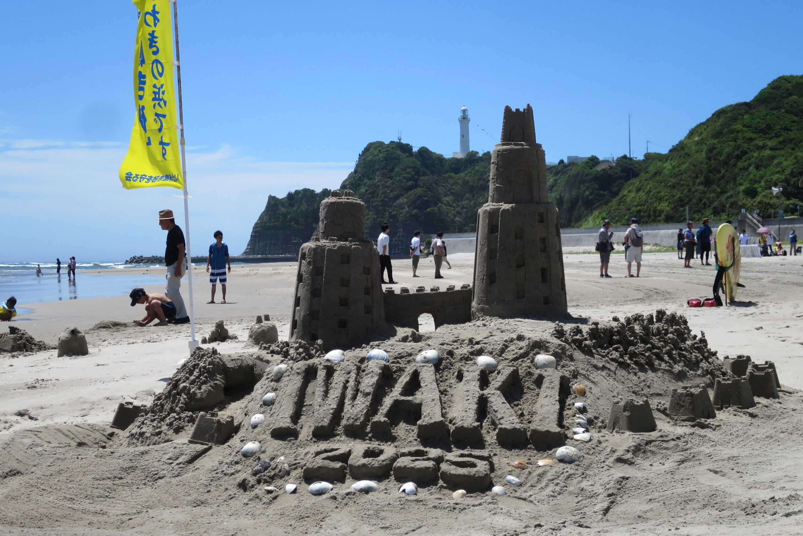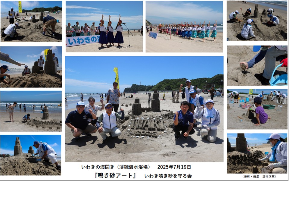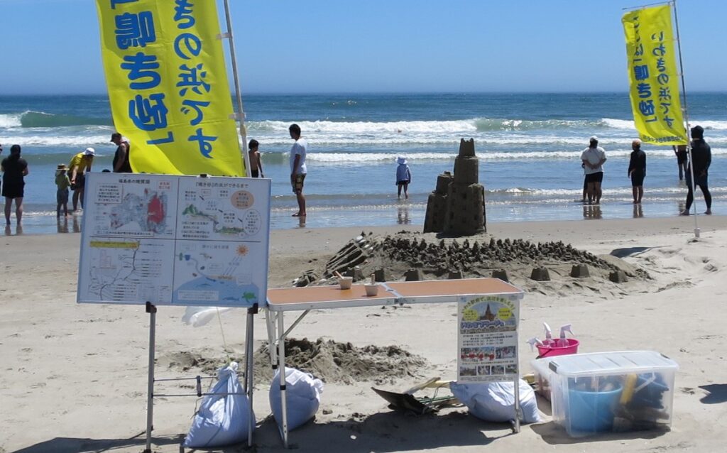 薄磯海水浴場で行われた、いわきの海開き式会場脇で、砂像の制作と鳴き砂体験コーナーを設置しました。
