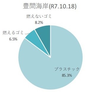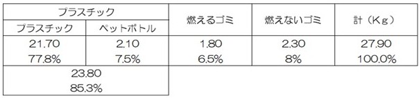 時間短縮のため、鳴き砂調査と並行しながらゴミ拾いを行うことにしました。漁具が多く ゴミの総量は27.9kgで、その内プラスチックごみは、23.8kgで85.3%を占めていました。