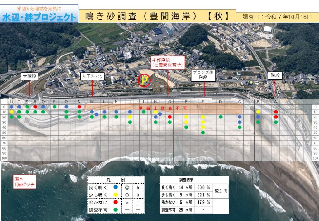今回の調査も、清掃を行いながら各測線(A~U)を海に10mピッチで調査を行いました。小さいお子さんも「キュッキュッ!」の音に、「ボクもボクもやりたい!」の歓声を上げながら、福島高専の学生会員の指導を受け、鳴き音を楽しんでいました。