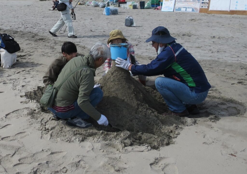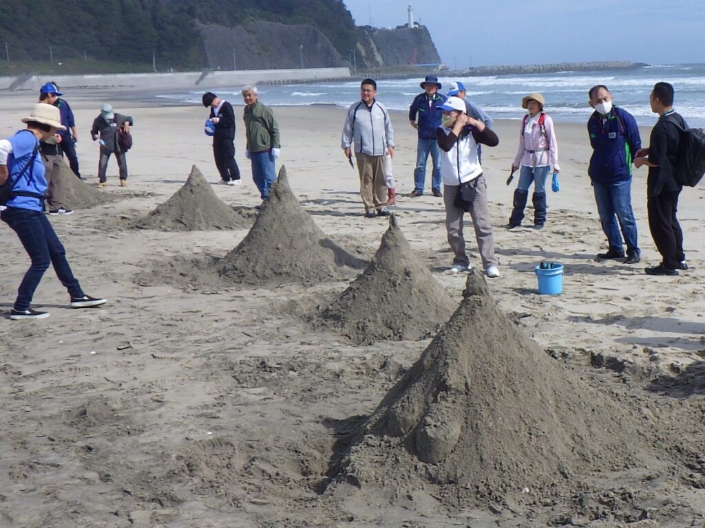鳴き砂調査の後は、大人も童心に戻って、砂遊び(砂山競争)です。鳴き砂調査の5班ごとに、10分間で砂山を造り、その高さを競います。作戦どおり進むでしょうか? フルパワーで10分間はきついですねー。