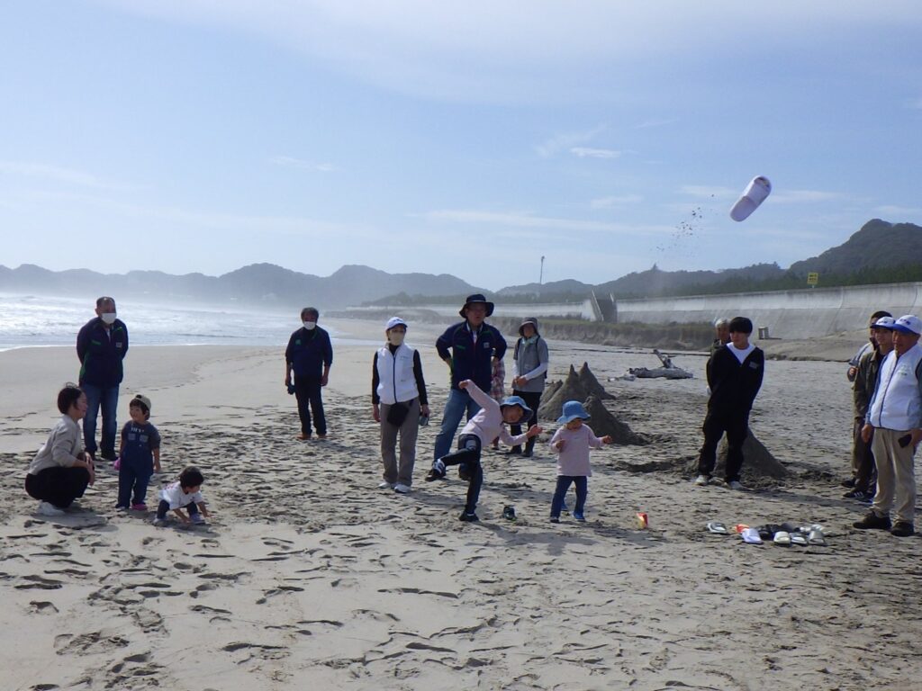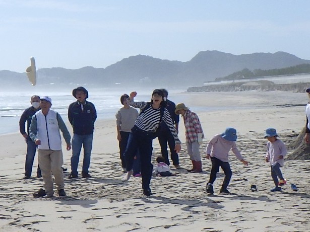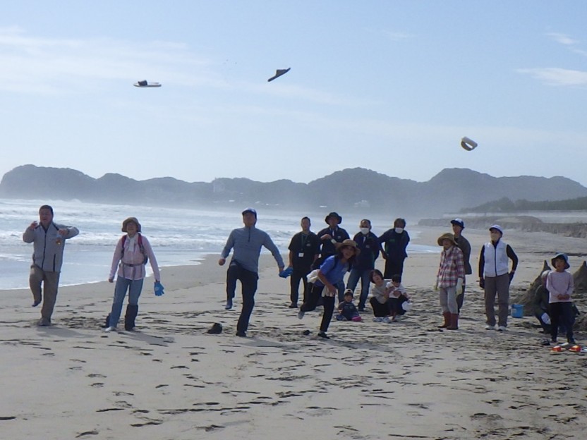 初めて取り入れたビーチサンダル飛ばし。個人戦です。鳴き砂調査の班ごとに予選を行い、班で1位だった人5人で決勝戦を行いました。お子さんは、子供チームで決勝戦。