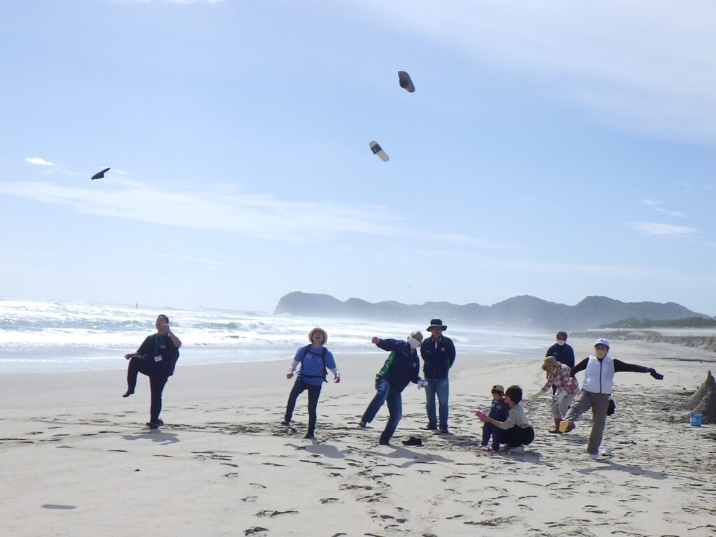 初めて取り入れたビーチサンダル飛ばし。個人戦です。鳴き砂調査の班ごとに予選を行い、班で1位だった人5人で決勝戦を行いました。